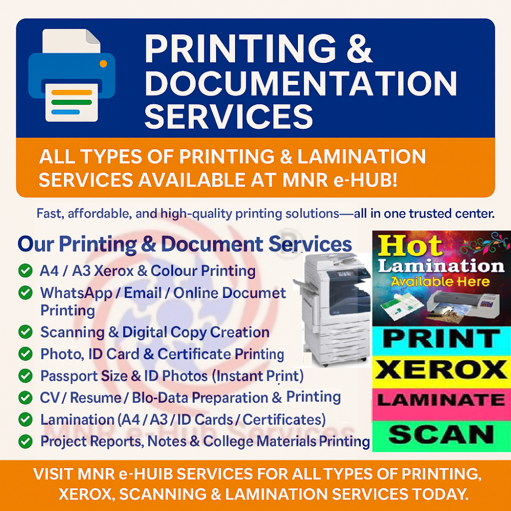 Xerox, Colour Xerox, WhatsApp/Email Prints, Aadhaar Download, Print & Lamination
