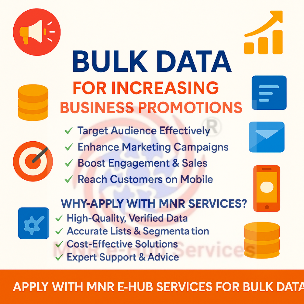 MNR e-Hub Services offers Bulk Data Solutions to help businesses expand their reach, attract the right customers, and maximize sales. With high-quality verified data, you can target specific audiences for marketing campaigns, product launches, and brand promotions. Whether you are a startup or an established company, bulk data gives you the edge in todayβs competitive market.