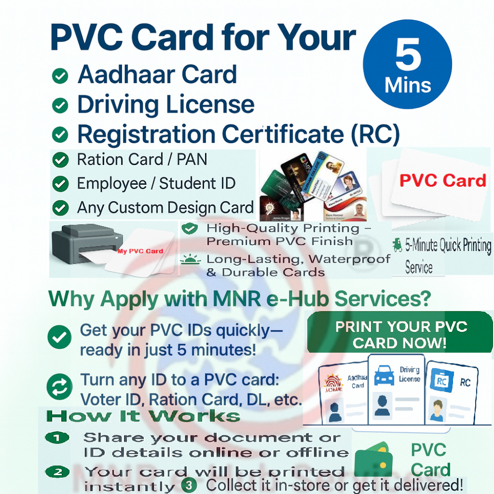 MNR e-Hub Services offers fast, high-quality, and affordable PVC card printing for all types of government and personal identification documents. Whether itβs an Aadhaar Card, Driving License, Voter ID, RC Book, or PAN, we make it premium and professional.